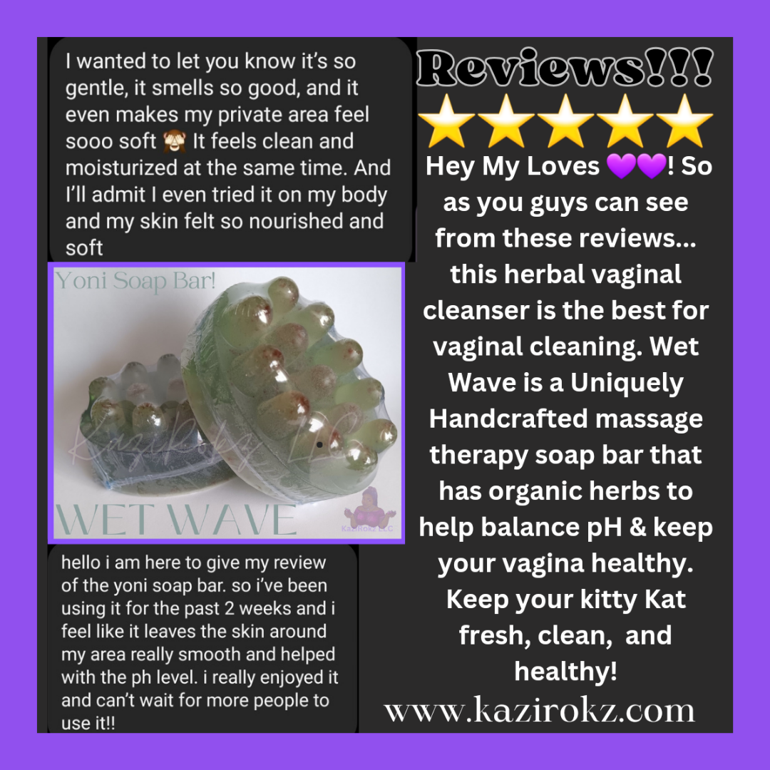 Hey My Loves💜💜, I just want to share this amazing PLANT BASED herbal vaginal cleanser "Wet Wave" with you all. When it comes to your YONI, what better care to have than our YONI BAR. It's balances pH, fights/ prevents yeast infection, cleanses bad bacteria, fights odor, and staying dry/ fresh for 24 to 48 hours. It's smells amazing too!