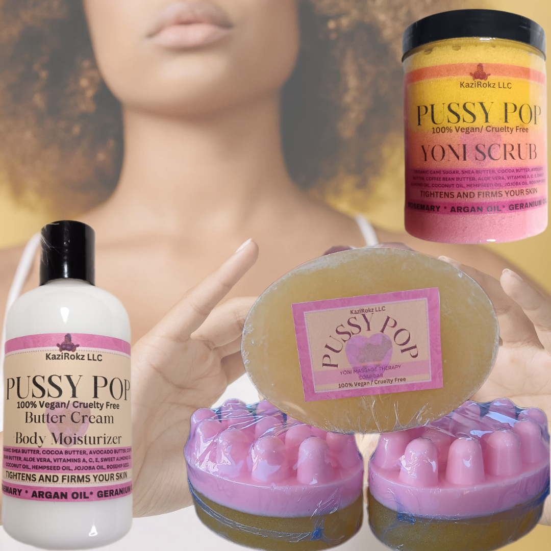 PUSSY POP TRIO KIT! Balance your pH, prevent itch, fights ingrown hairs. 100% Vegan / Cruelty Free Body scrub, Soap bar,Butter cream body moisturizer