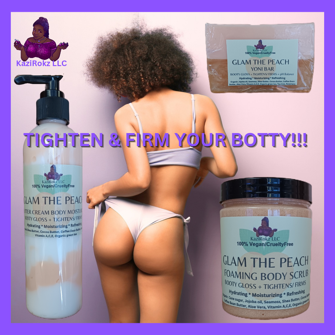 Ultimate Vegan Body Care: Treat Your Peach with my BOOTY BOOSTER Products. Let's get you started with oour GLAM THE PEACH foaming body scrub!