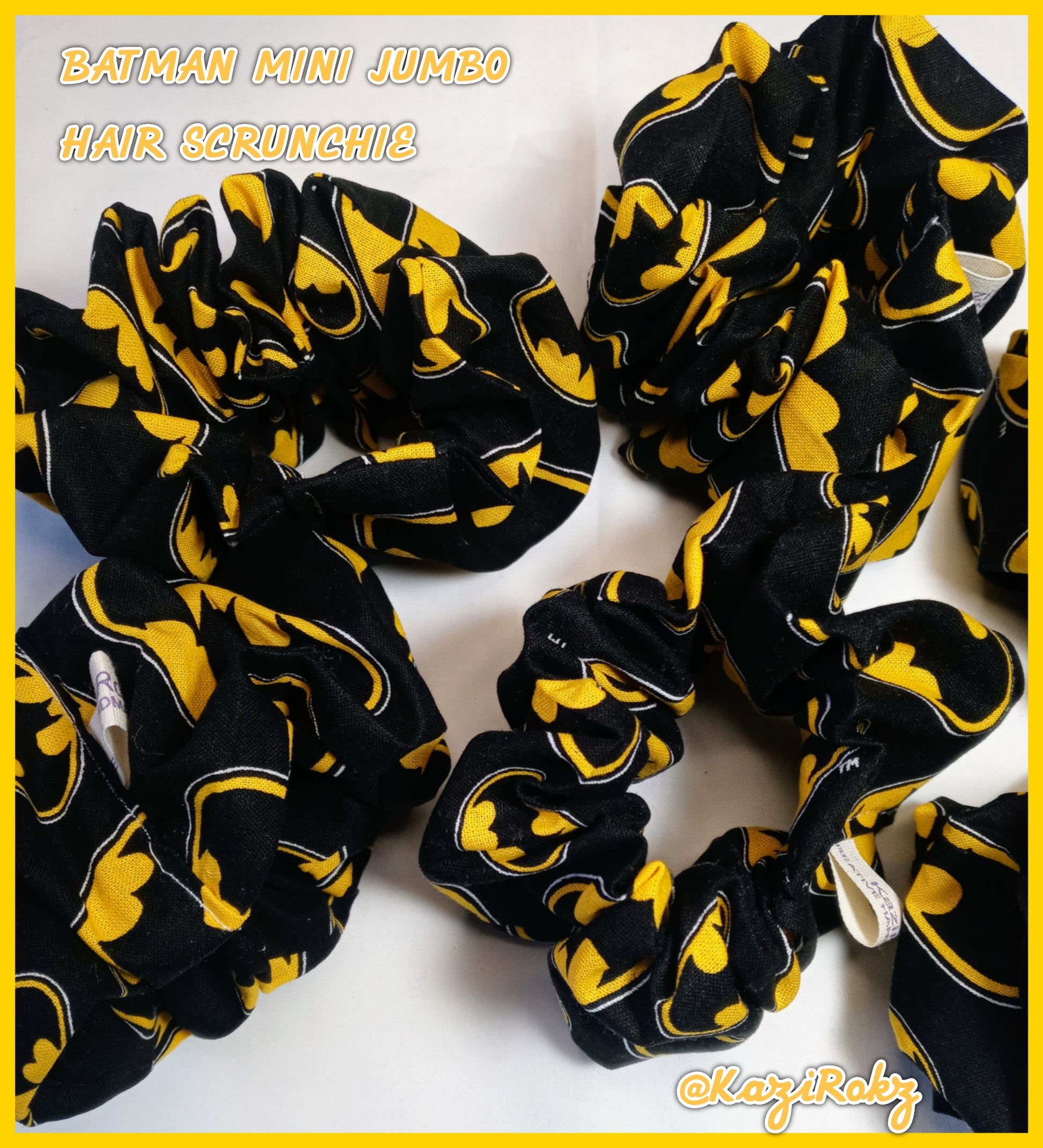 This creative and unique jumbo hair scrunchie is for all of my "Batman" superhero fans! This hair Scrunchie is handmade with 100% cotton fabric, thread and, elastic band. Feel free to enjoy wearing a jumbo hair Scrunchie that's cute and different from everyone else's. This jumbo hair Scrunchie will definitely set the tone and turn heads wherever you go. So if you want to look creative in every way? purchases this creative black, yellow, and white Batman mini jumbo hair scrunchie.