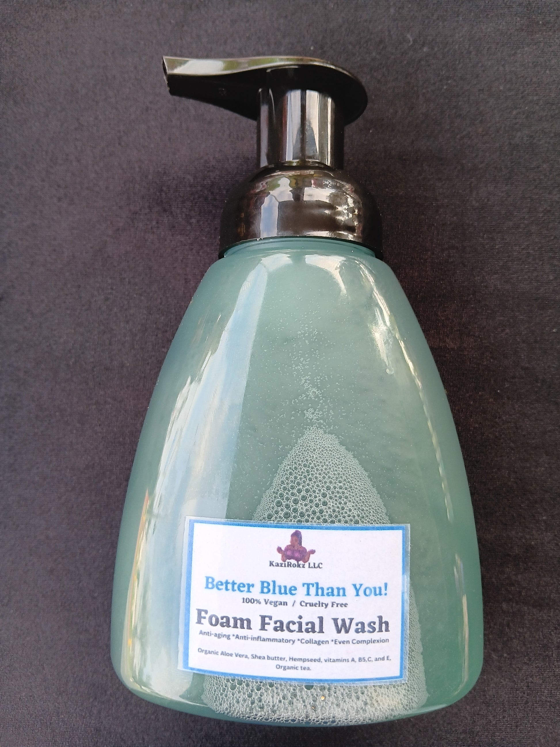 Let's get right to the point... Are you looking for a Facial cleanser that's safe for all skin types? (This all natural and organic facial cleanser is plant based) Then yes, KaziRokz LLC Better Blue Than You! Organic Tea Facial Cleanser is right for you. This 100% Vegan & Cruelty free facial cleanser is a foam soap base, and it's safe for your entire family. This facial wash is packed with flavonoids to help stimulate Collagen production, and help develop / maintain skin elasticity. It also has anti-glycation properties, which are known to slow down aging of the skin. Its Anti-inflammatory and helps treat skin irritation, redness, itching, and allergies. This facial wash is great for reducing skin inflammation, blemishes, eczema / psoriasis, and acne. It's perfect for getting rid of those nasty ugly pimples. This facial cleanser also helps with wrinkles, blocked pores, and dry skin. You can't go wrong with this facial wash!!! Your skin will literally fall in love with it. It's so gentle on your skin, and will not strip your skin of moisture. Your skin will look & feel moisturized, hydrated, and it will give your skin that natural glow. This product comes in a 10oz plastic bottle with foam pump cap.