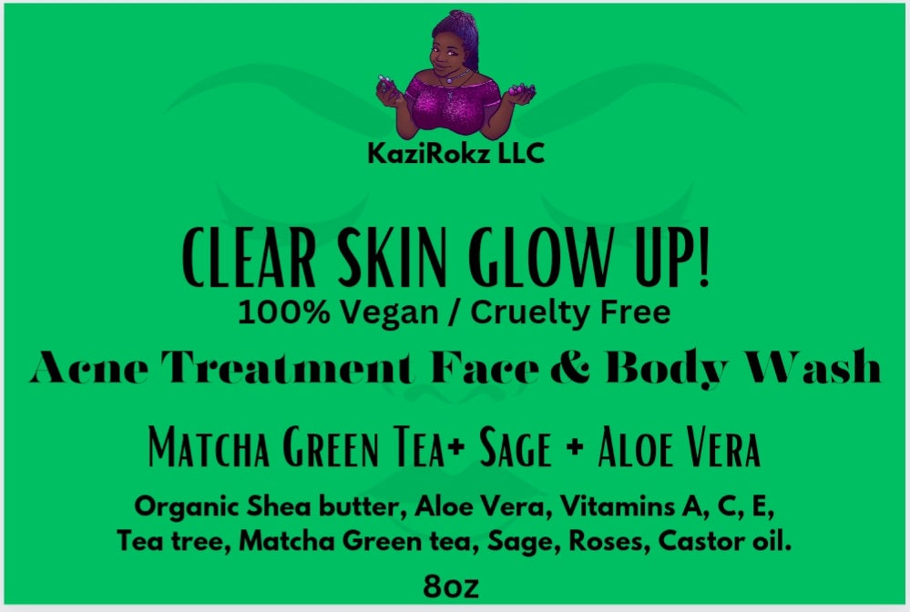 CLEAR SKIN GLOW UP! Acne Treatment Face & Body Wash! Matcha Green Tea, Sage, Roses. 8oz, 100% VEGAN/ CRUELTY FREE.