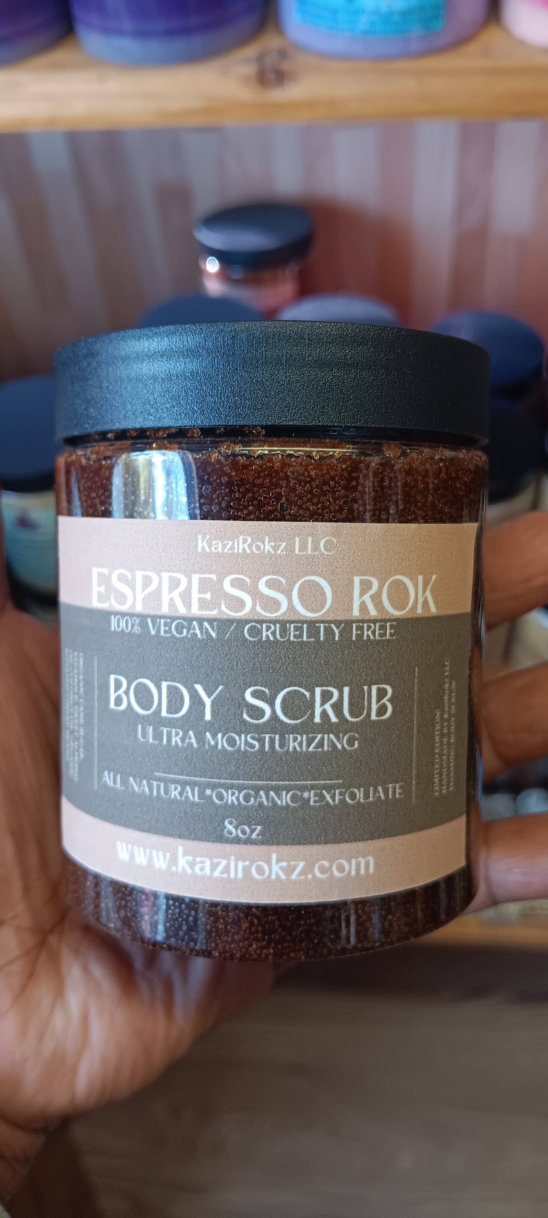 Hello "Espresso Rok"! KaziRokz LLCs its a 100% Vegan / Cruelty Free foaming sugar body scrub. Espresso Rok is 1 of a kind. It's more than a exfoliator, it's also a wake me up for blackheads. You will see this scrub go into action right away. You can literally feel the scrub working as you massage it into your skin. This foaming scrub has somany health benefits for your skin like, firming and tightening your skin, increases blood flow and reduce the appearance of cellulite, it works as an exfoliator and anti-inflammator agent, it's packed with antioxidants, and the aroma is naturally therapeutic! Exfoliate and hydrate your skin the espresso way. This scrub is good for all skin types. It will help draw out blackheads and toxins out pf your pores. It will then hydrate and moisturize your skin, bringing back its natural tone and texture. It cleanses your skin like no other. It's handmade in small batches with all natural and organic ingredients. It comes in a 8oz plastic container with a lid.