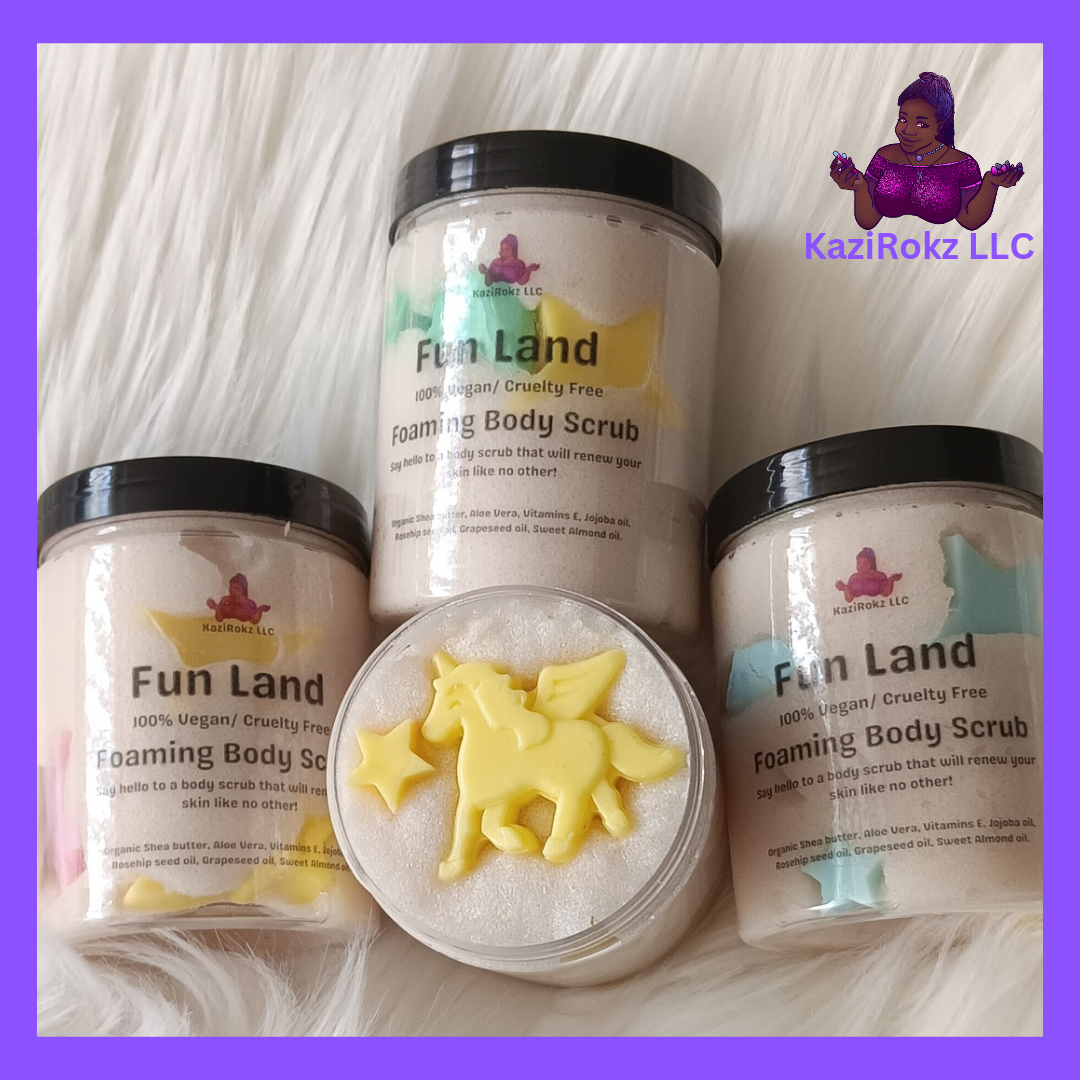 FUN LAND Foaming Body Scrub FOR KIDS! 100% Vegan/ Cruelty Free and handmade with organic ingredients. Bath time fun, Soap and soap scrub. Sensitive skin, dry skin treatment.