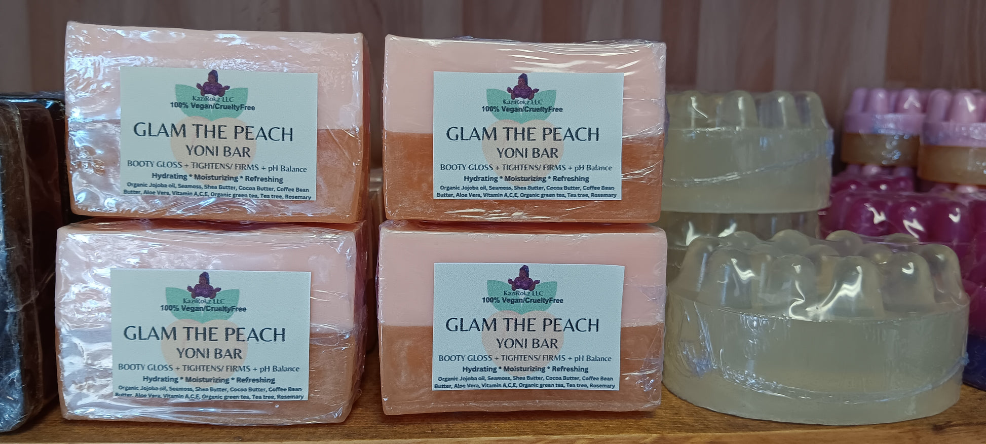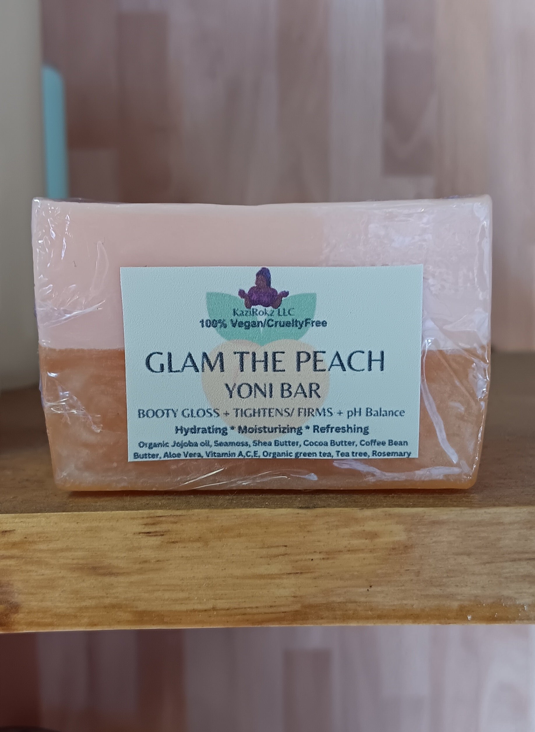 KaziRokz LLC Organic and ALL Natural BOOTY BOOSTING GLOSS soap bar that does everything. This saop bar servesas a YONI Bar too. "GLAM THE PEACH" TIGHTEN AND FIRMING Yoni Bar is the best for your skin. It smells amazing too, like the summer citrus peach. This Yoni Bar is great for aromatherapy, clearing up BOOTY acne, firming / toning skin, moisturizing itchy skin, healing eczema / psoriasis, plus more. This Yoni bar is intended to promote healthier skin! It's packed with organic herbs, vitamins, and organic oils to assist your skin with maintaining your elasticity, Collagen, and healthier appearance.