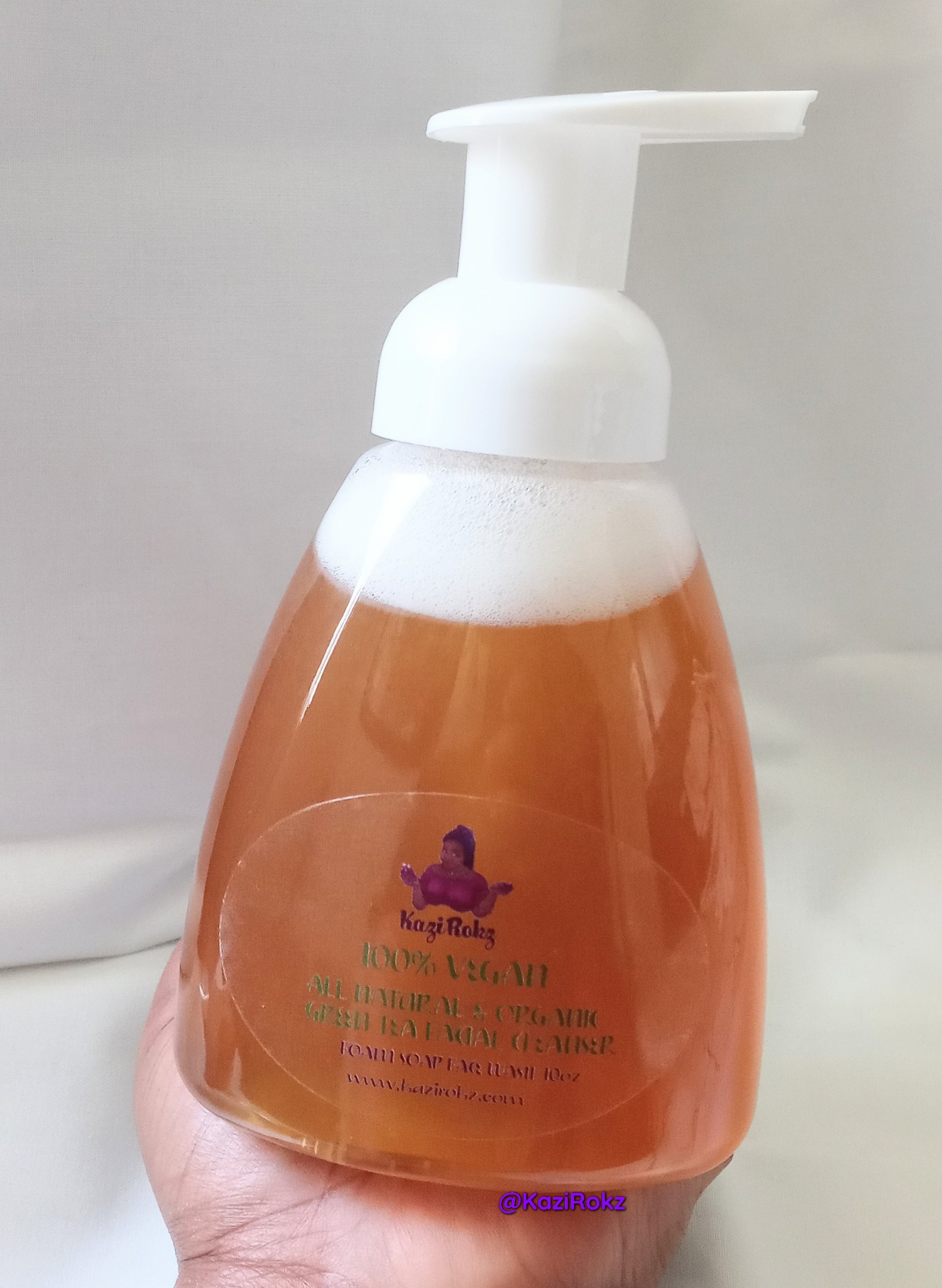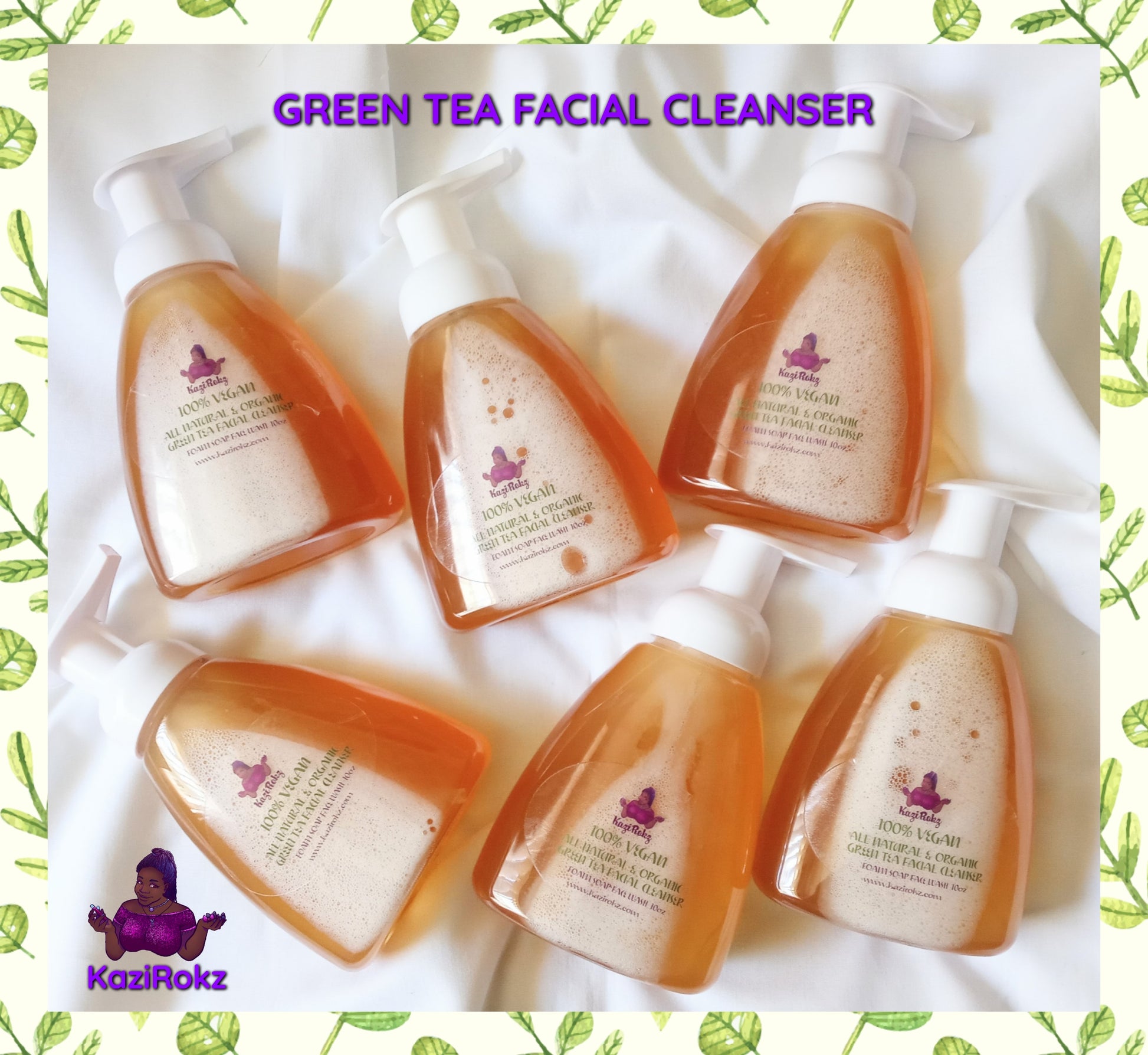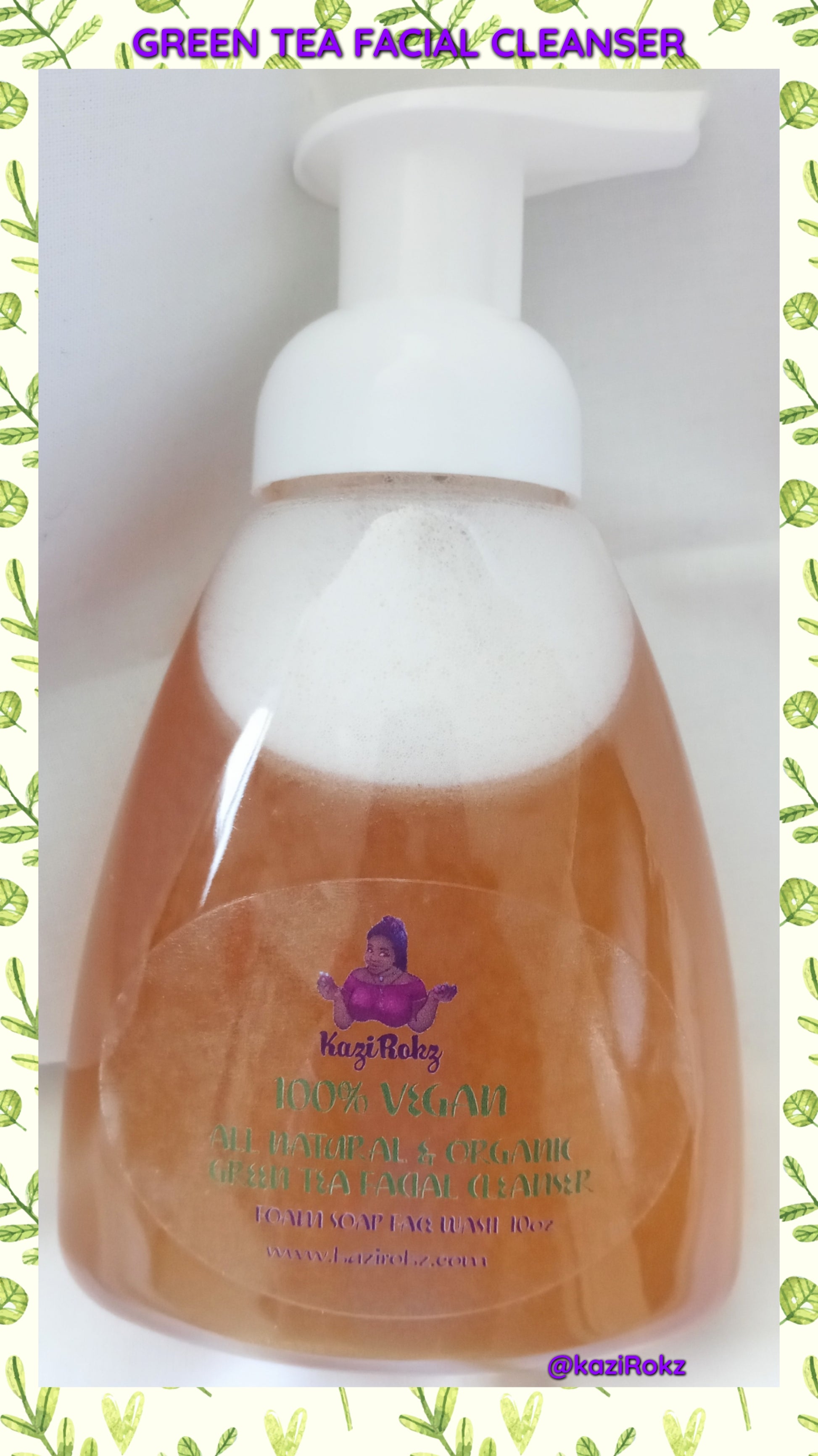 Let's get right to the point... Are you looking for a Facial cleanser that's safe for all skin types? (This all natural and organic facial cleanser is plant based) Then yes, KaziRokz Green Tea Facial Cleanser is right for you. This 100% Vegan & Cruelty free facial cleanser is a foam soap base, and it's safe for your entire family. This facial wash is great for reducing skin inflammation, blemishes, eczema / psoriasis, and acne. It's perfect for getting rid of those nasty ugly pimples. This facial cleanser also helps with wrinkles, blocked pores, and dry skin. You can't go wrong with this facial wash!!! Your skin will literally fall in love with it. It's so gentle on your skin, and will not strip your skin of moisture. Your skin will look & feel moisturized, hydrated, and it will give your skin that natural glow. This product comes in a 10oz plastic bottle with foam pump cap.