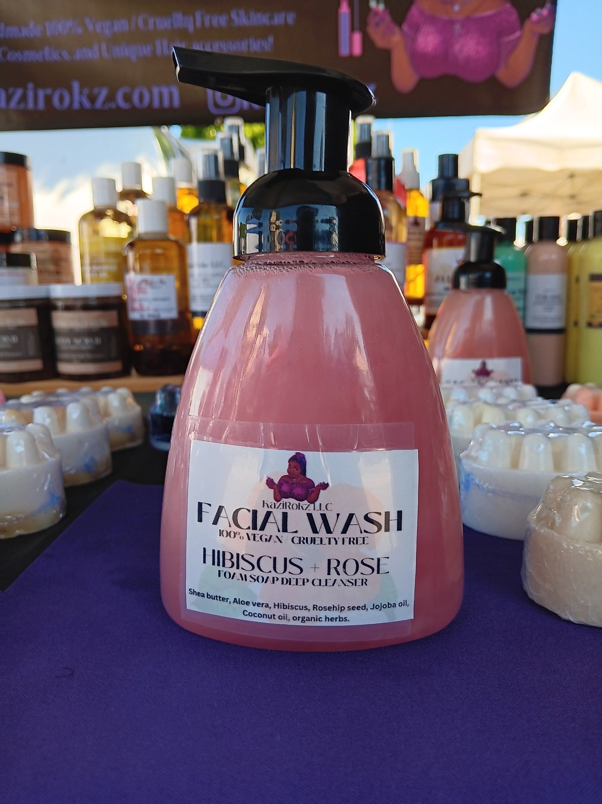 Let's get right to the point... Are you looking for a Facial cleanser that's safe for all skin types? (This all natural and organic facial cleanser is plant based) Then yes, KaziRokz Hibiscus + Rose Facial Cleanser is right for you. This 100% Vegan & Cruelty free facial cleanser is a foam soap base, and it's safe for your entire family. This facial wash is great for reducing skin inflammation, blemishes, eczema / psoriasis, and acne. It is literally a beauty secret in a bottle. It has natural properties that hydrates, tones, reducesI oily skin, and increases the Elasticity of your skin. t's perfect for getting rid of those nasty ugly pimples. This facial cleanser also helps with wrinkles, blocked pores, and dry skin. You can't go wrong with this facial wash!!! Your skin will literally fall in love with it. It's so gentle on your skin, and will not strip your skin of moisture. Your skin will look & feel moisturized, hydrated, and it will give your skin that natural glow. This product comes in a 10oz plastic bottle with foam pump cap.