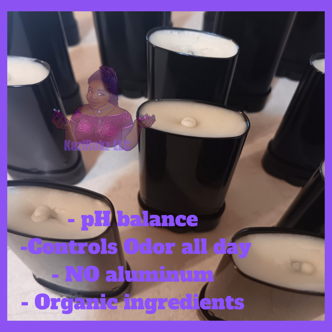 KaziRokz LLC Organic Deodorant is handcrafted in small batches and made with all natural and organic ingredients. It's packed with vitamins, organic skin protection from odor, and bacteria. No harmful chemicals, Parabens, harsh ingredients, testing on animals, or preservatives. This deodorant, made with you in mind... You, who struggled and or is still struggling with irritation from using NON ORGANIC DEODORANT. This deodorant is great for all skin types, ages, and genders. It's perfect for absorbing moisture and keeps odor away for 24hrs. It helps balance PH, and restores microbial flora for Detoxifying.