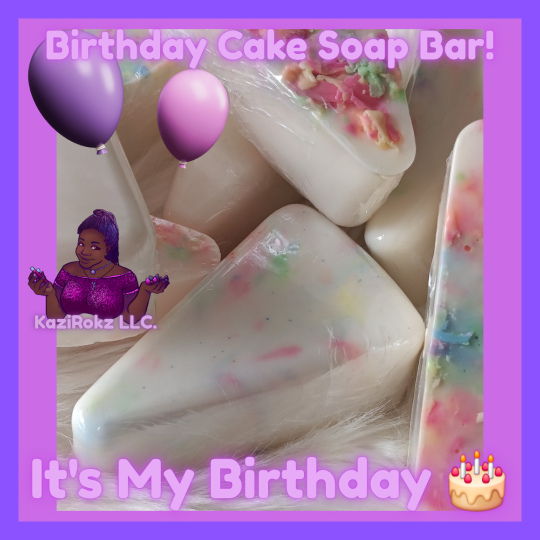 KaziRokz LLC "LET'S CELEBRATE" BUTTER CREAM YONI bar is a masterpiece! This is a advanced YONI soap bar. This soap easily lathers your skin, cleaning off dirt, oil, and germs / bacteria from your skin & Yoni. It's great for cleansing your vaginal area. It's also great for clearing pimples, eczema, dry skin, damage skin, blemishes, and more. This soap bar acts as the best cleanser for your under arms, inner thighs, and buttocks too. Balancing your PH, controlling odor, and staying dry in those sensitive areas is a must. It Leaves your skin moisturized, and revitalized. Plus, your skin will feel / look smooth, soft, and refreshed. Taste Me is 100% vegan / cruelty free and is safe for your entire family! It's a bar so it easily calms you while cleaning your skin. This soap bar has lots of benefits and is also rich in vitamins A, C, E, & B12. Let's not forget that it smells amazing too sweet birthday cake.