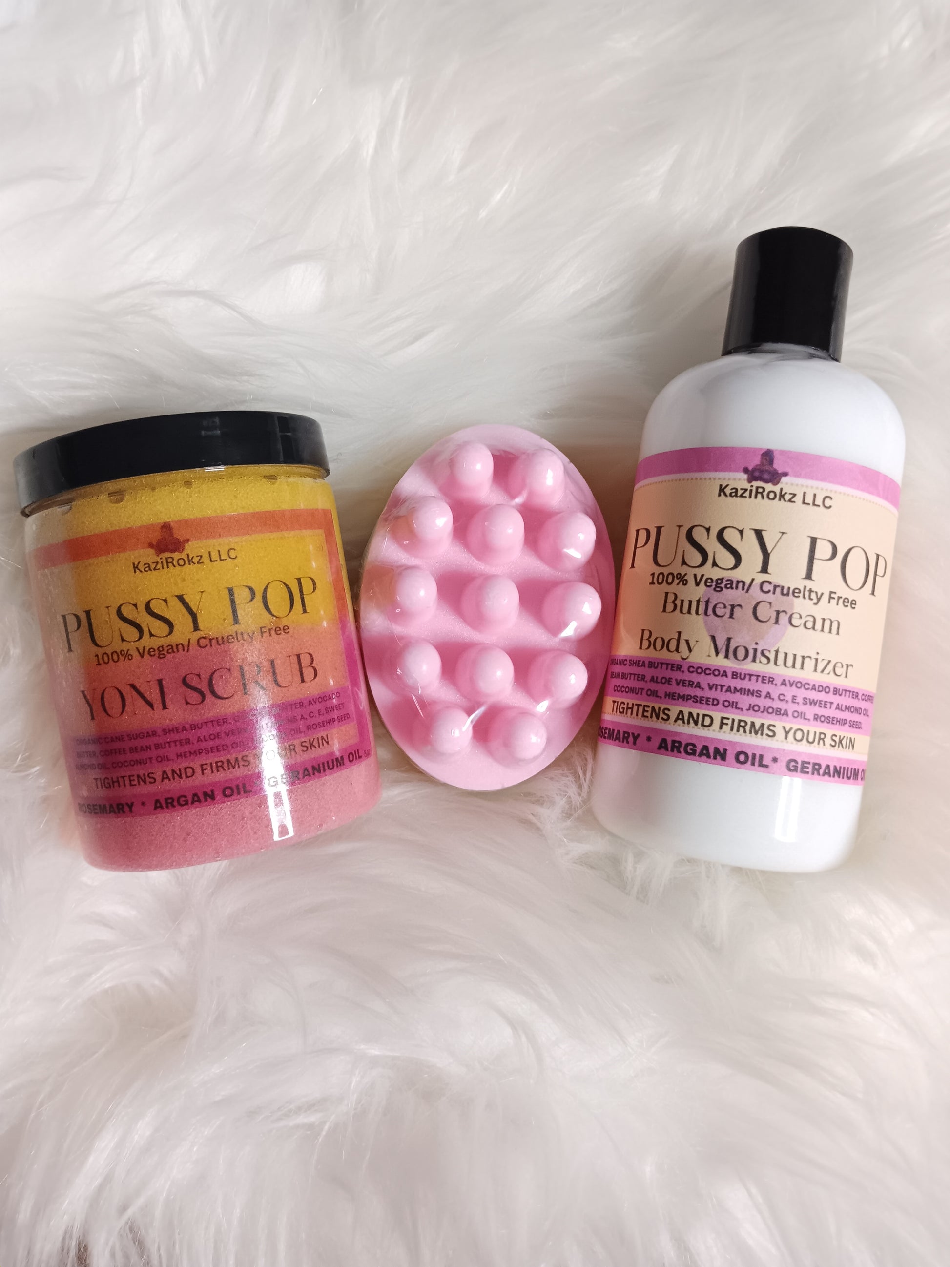 PUSSY POP TRIO KIT! Balance your pH, prevent itch, fights ingrown hairs. 100% Vegan / Cruelty Free Body scrub, Soap bar,Butter cream body moisturizer
