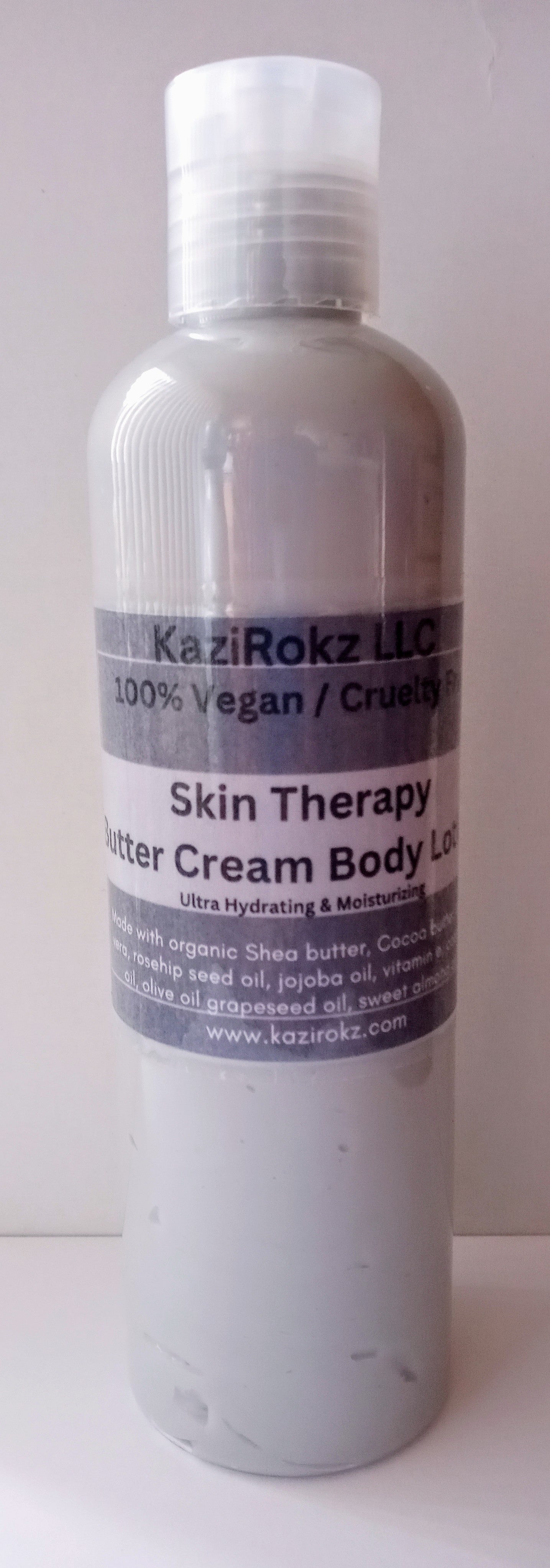KaziRokz Skin Therapy Butter Cream Lotion is one of a kind!!! Hydrating and moisturizing. It's perfect for all skin types and it's so soothing for skin that suffers from eczema. This lotion is 100% Vegan friendly and cruelty free. Its smells amazing too. Its long lasting and gentle on your skin. KaziRokz LLC Butter Cream Body Lotion is creatively handcrafted with love and care.