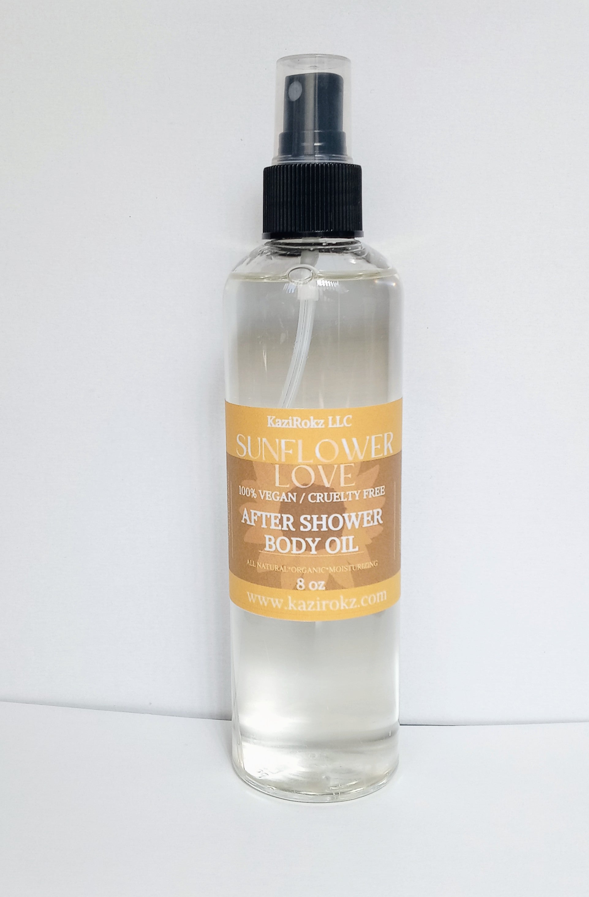 KaziRokz LLCs after shower oil, Sunflower Love is one of a kind. It's the perfect oil for your body if you're looking for an oil that will moisturize your skin after a shower or bath, and leave it smelling good too. This oil is loaded with vitamin E, and other organic ingredients to keep your skin healthy and smooth. It has a sweet sunflower scent that you will fall in love with. This oil is ultra hydrating and moisturizing. It's a light oil so it won't leave your skin feeling heavy or sticky. This oil comes in 8oz plastic spray bottle.