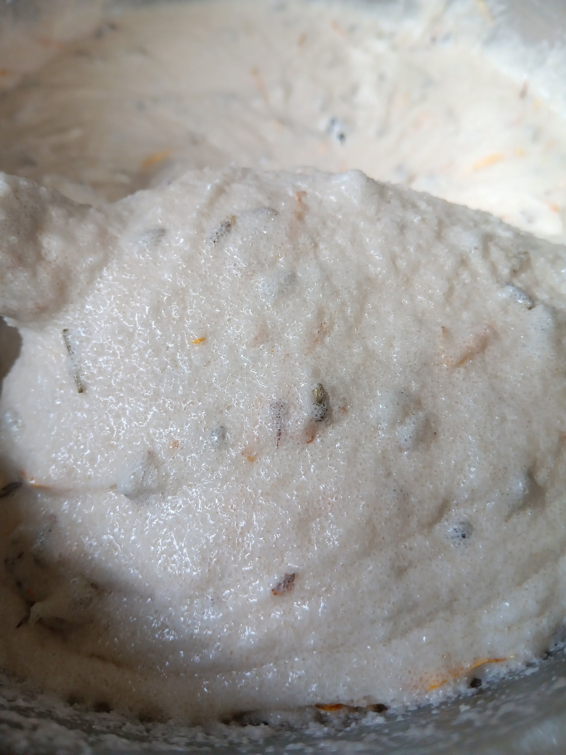 Ingredients: Organic Raw refined shea butter, organic lavender plant, Geranium oil, Rosehip seed oil, Jojoba oil, Hempseed oil, sweet almond oil, coconut oil, avocado oil, organic dried calendula, Aloe Vera gel, vitamins A,B5,C,E, Organic blue tea flowers.