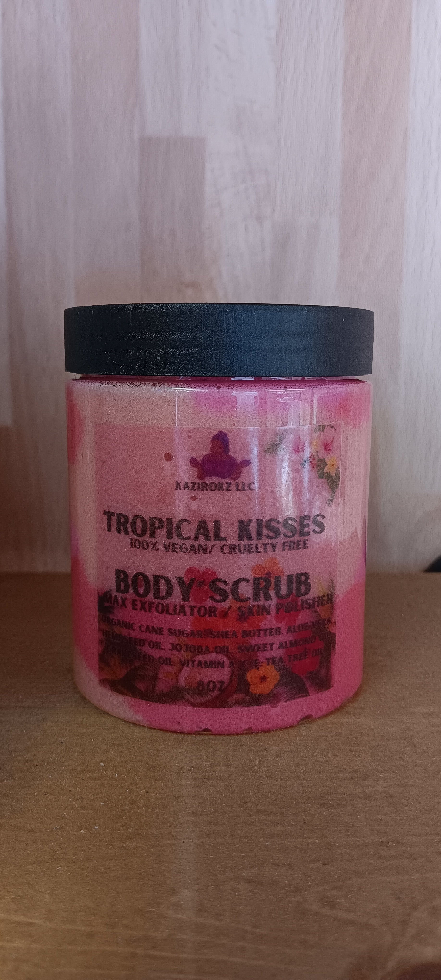 KaziRokz LLC Tropical Kisses foaming body scrub is sensationally satisfying! Your skin will love this multi purpose, head to toe body scrub. It's made to perfection and if you're into EXOTIC TROPICALFRUITS, then this scrub is perfect for you. This scrub has so many unique befits for your skin. Benefits like *TIGHTEN YOUR SKIN*LESS CELLULITE APPEARANCE*ALLERGY RELIEF*REDUCE NAUSEA*BOOST SKIN HEALTH*PAIN RELIEF*SUNBURN RELIEF*BOOST ENERGY. Not to mention, the smell of tropical fruits is very refreshing, relaxing, and therapeutic. It's so soothing and relaxing for the body and skin. It's made with all natural and organic ingredients too. This scrub is perfect for all skin types. It exfoliates and moisturizes your skin. It helps to fight inflammation in your skin, blackheads, pimples/ body acne, dry chapped skin, and more. Release all negative energy and stress. This Body Scrub will help calm and sooth your mind and body! This body scrub comes in a 8oz plastic container with a lid.