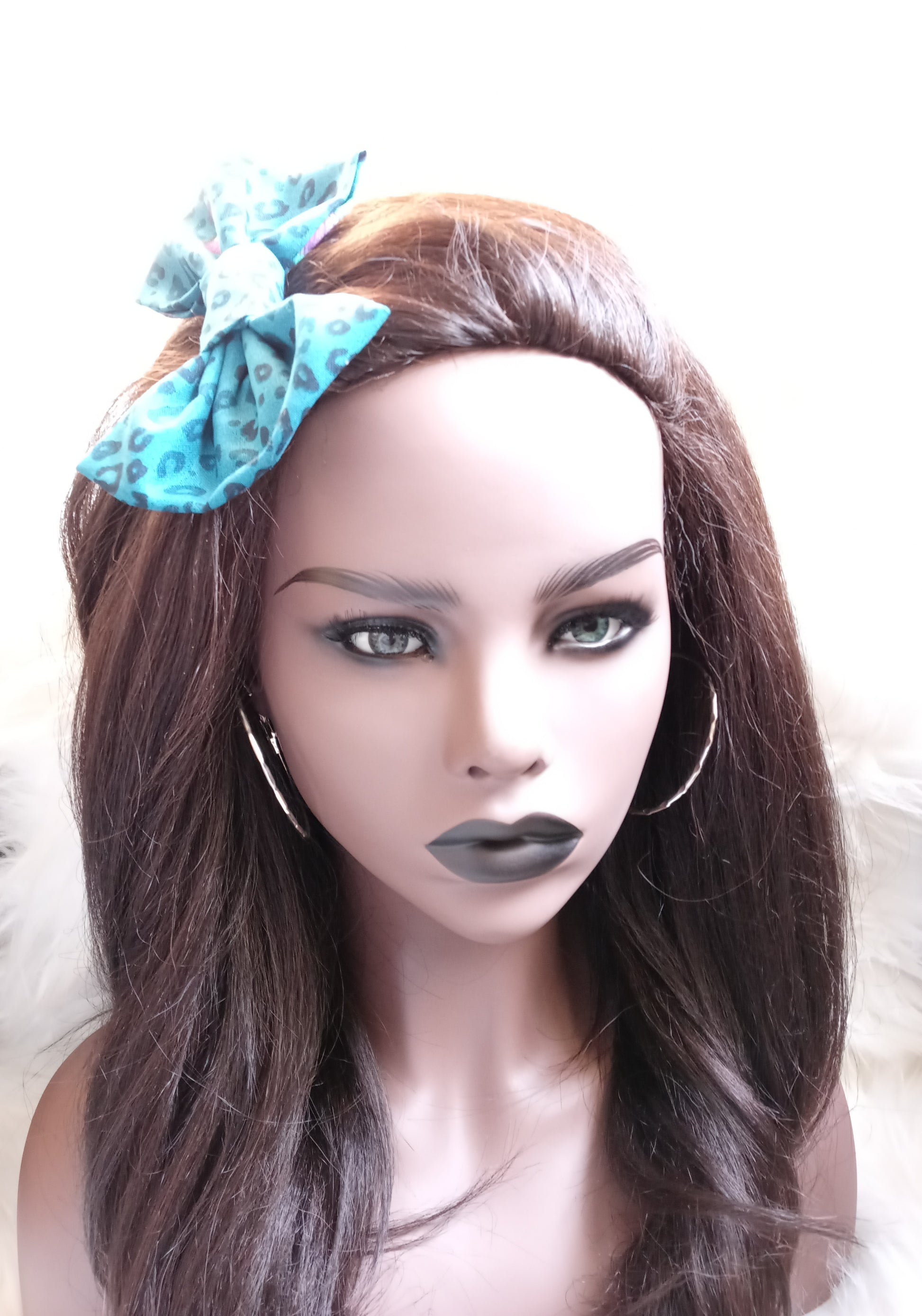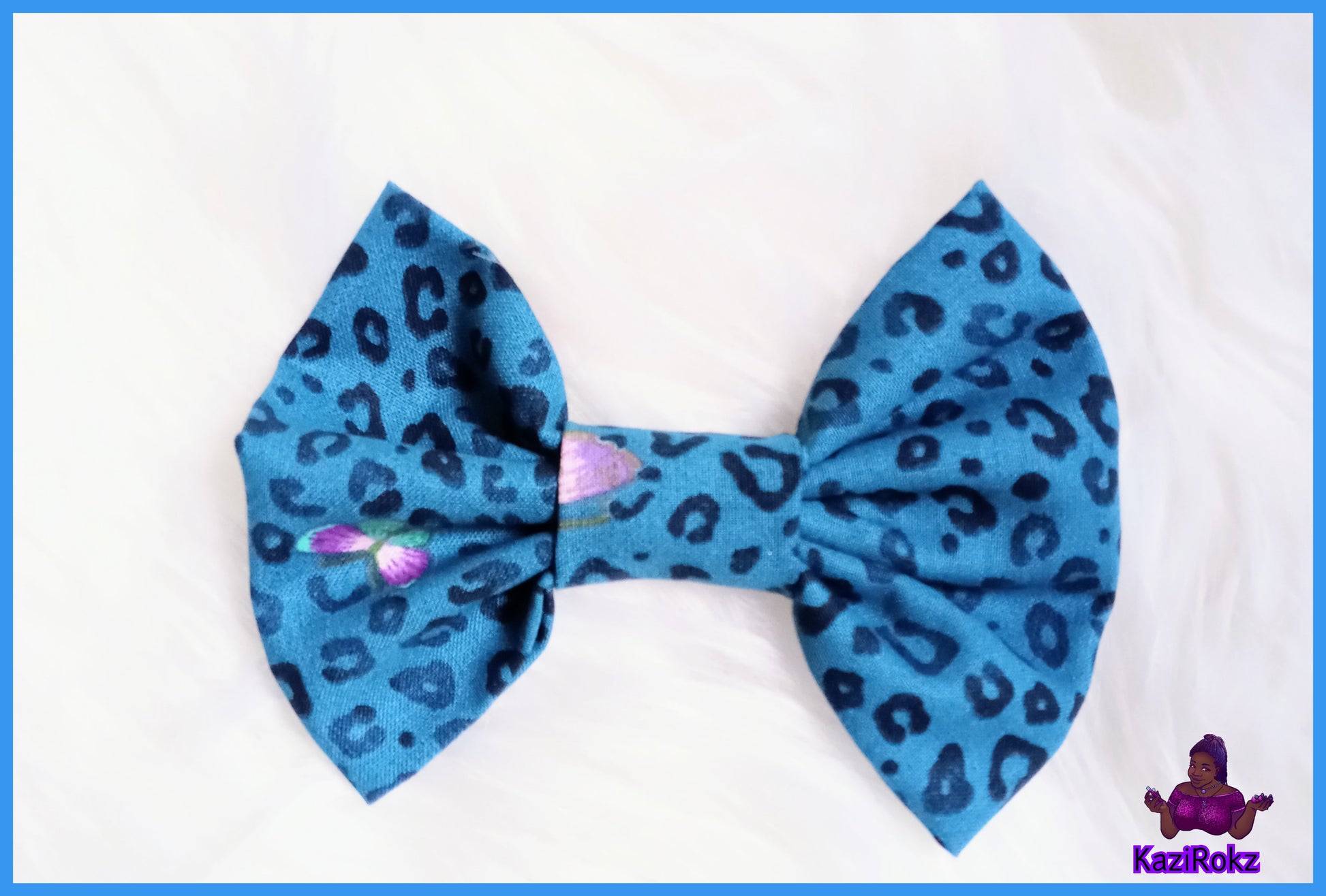 This handmade hair bow is too cute to pass!!!. Turquoise with animal print, and purple butterflies. This hair bow is handmade with 100% Cotton, thread, and a hair clip. This bow is sturdy, and high quality. It's ideal and appropriate for all age groups. Dry cleaning is recommend for up keeping of this hair bow. This hair bow is medium size.
