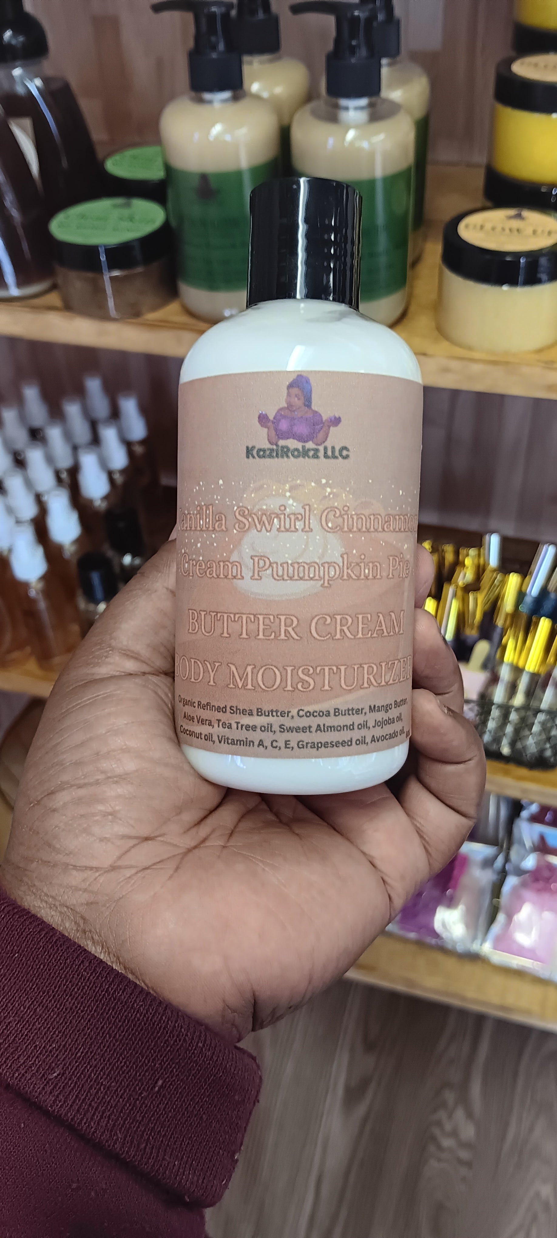 KaziRokz LLC Organic and ALL Natural HIGHLY ADVANCED Fall Themed butter cream VANILLA SWIRL CINNAMON CREAM PUMPKIN PIE is the best FORMULA for all skin types. This butter cream is great for aromatherapy, clearing sinuses, clearing up body acne, firming / toning skin, moisturizing itchy skin, healing eczema / psoriasis, plus more. This butter cream is intended to promote healthier skin! It's packed with organic herbs, vitamins, and organic oatmeal. It's the butter cream for this fall weather and it smells like a snack! If you like the smell of vanilla and pumpkin, then you're definitely going to love this Butter Cream.
